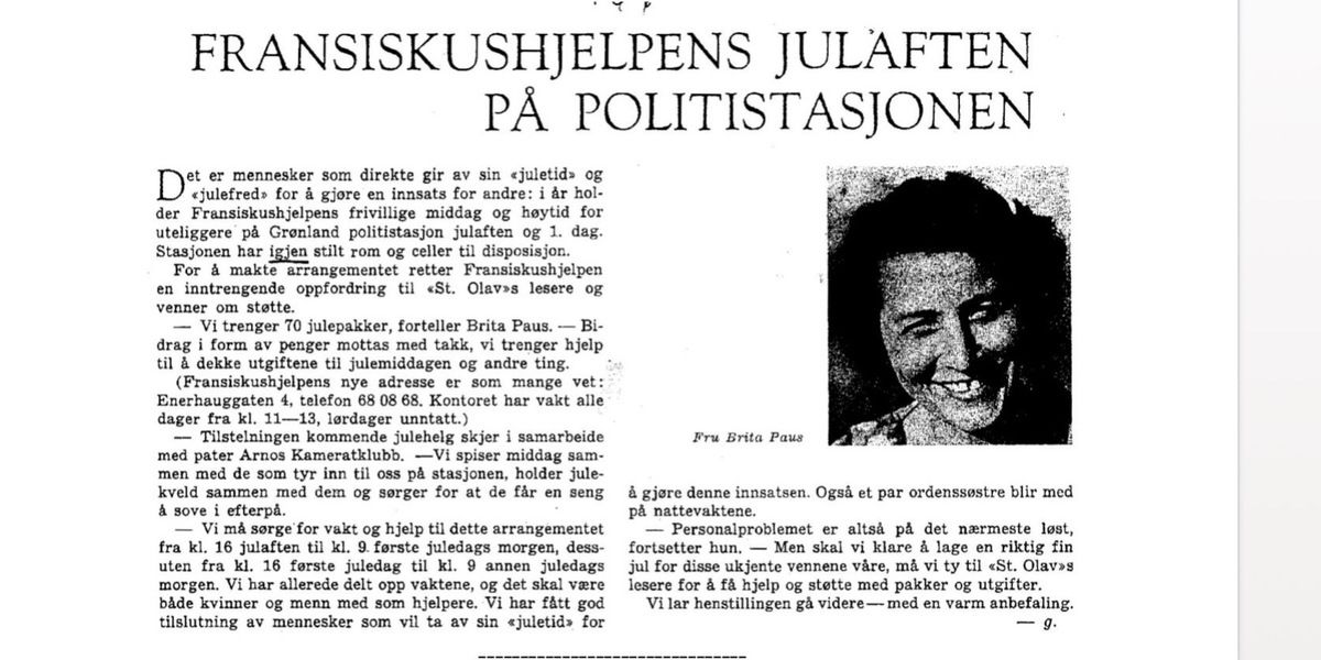 Høsten 1956 blir Fransiskushjelpen stiftet med formålet ”å hjelpe trengende og prøve å aktivisere de troende i nestekjærlighet.” Brita Paus blir organisasjonens første leder. Fransiskushjelpen ble styrt fra et bord i menighetslokalet, og alt arbeidet er basert på frivillig innsats. Les mer om Brita her.